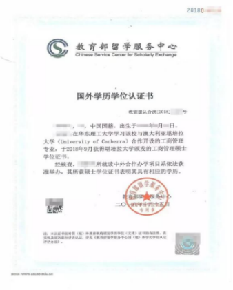 《国外学历学位认证书》示例