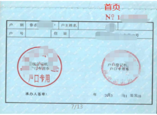 户口本首页及本人页照片示例