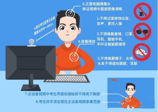 (4)考生复试时正向面对第一机位,保证头肩部及双手出现在视频画面中,保证面部清晰可见,头发不得遮挡面部、耳部,不得佩戴帽子、耳饰、口罩、耳机、智能手表、手环及智能眼镜等。第二机位须保证视频呈现考生腰部、桌面、视频电脑的第一机位的屏幕图像。
