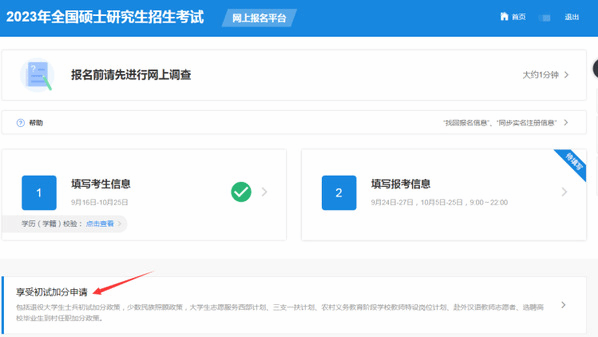 符合初试加分政策规定条件并申请享受初试加分政策的考生,应在完成报名信息填报后在“享受初试加分申请”模块(网上报名首页中部)提交申请,相关部门审核通过后考生可享受相应政策。报名期间可取消或修改相关申请。