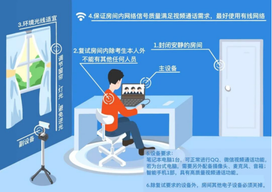 (1)考生须提前确定适于复试的封闭、安静的复试场所,室内应保持干净整洁,背景和桌面无杂物,光线充足。房间内除考生本人不能有其他人员。周围环境不得对复试产生干扰。