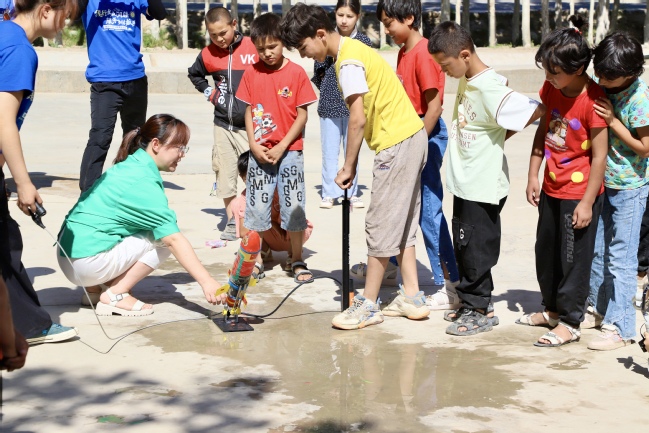 活动现场,物理与电子工程学院教师第一党支部邹艳波、麦麦提依明·吐孙、秦晨,校团委暑期“三下乡”社会实践团成员共同带领同学们完成会飞的纸屑——气球摩擦起静电、看不见的力——气球摩擦起电、户外“水火箭”科普实践三项实验展示,并讲解其中原理。