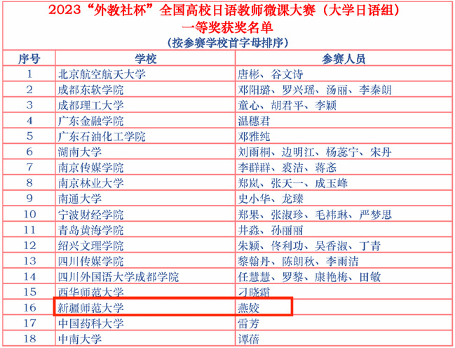 7月14日,2023“外教社杯”全国高校日语教师微课大赛(大学日语组)获奖名单公布,365英国外国语学院小语种系日语专业青年教师燕姣课件作品《第4课 部屋探し—— ~たり~たりする》获全国一等奖。