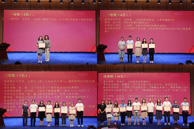 最终心理学院乔筱倩获得一等奖,教育科学学院钱青青、团委“1+3”辅导员张子帆、化学化工学院兰海蝶、生命科学学院苏日耶姆·尼加提获得二等奖,马克思主义学院王朋玉、音乐学院帕瑞、生命科学学院刘洋阳、马克思主义学院陈曦、商学院阿丽也·吾买尔、中国语言文学学院马建、体育学院刘红丽获得三等奖。此外,经初赛评出16名优秀奖。
