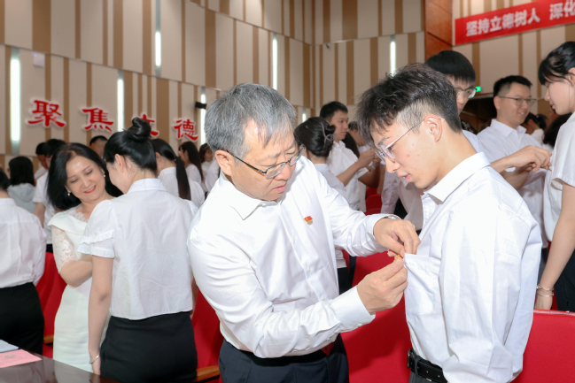 为新入党党员代表佩戴党员徽章