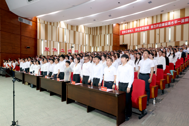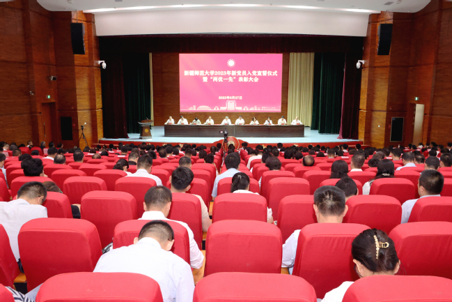 大会在庄严的国歌声中拉开帷幕。在全校师生党员的见证下,校领导、基层党组织老党员代表为102名新入党党员代表佩戴党员徽章。在领誓人葛国的带领下,全体师生党员面向鲜红的党旗,右手握拳齐肩举起,铮铮誓言掷地有声,表达了对党的崇高信仰与无限忠诚以及为党的事业奋斗终身的坚定决心。