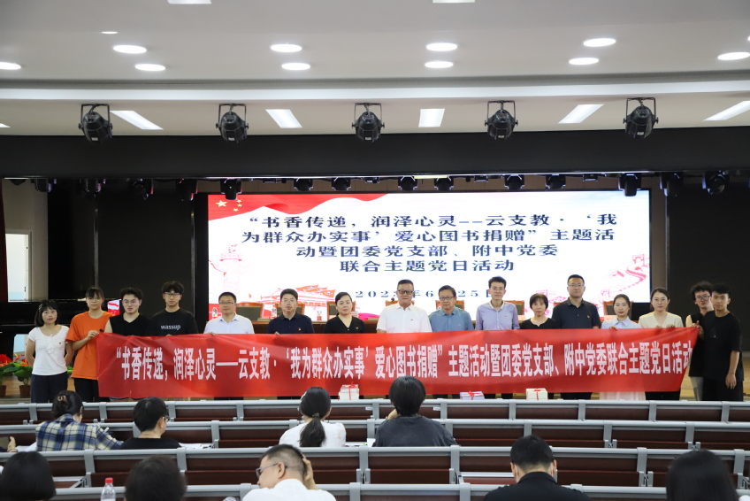 为深入学习贯彻习近平新时代中国特色社会主义思想和党的二十大精神,以深学促实干,把为民办实事作为主题教育重要内容,坚持问题导向,了解掌握群众所需所盼,积极为群众办实事、解难题,切实把学习成果转化成为人民服务的内在动力,深入拓展“我为群众办实事”实践活动形成的良好机制,6月25日下午,校团委、附属中学联合举办“书香传递,润泽心灵—云支教·‘我为群众办实事’爱心图书捐赠”主题活动暨团委党支部、附属中学党委联合主题党日活动。校党委常委、副校长陈彤出席活动并讲话,团委党支部成员、附属中学全体党员及大学青年志愿者代表参与活动。