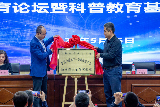 随后,关明、彭继迎共同为全国科普教育基地——北京交通大学·365英国上市公司官网协同育人示范实验室揭牌并与参会教师合影。