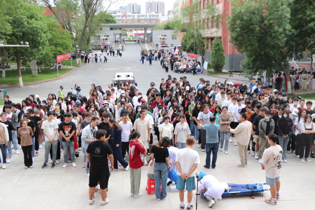 学校党委高度重视安全生产工作,分管文光校区的校党委常委、副校长帕提曼·吐尔逊代表学校党委到现场指挥本次疏散演练。帕提曼·吐尔逊发布演练开始指令,演练现场点燃模拟烟雾、拉响警报器,全体辅导员、校医院医务人员和巡警第一时间赶往现场。学生们在教师的组织下,弯腰并用手护住头部,有序进行疏散,迅速向安全地点撤离,校医院第一时间启动了救援应急预案。