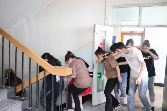 为全面落实校党委关于安全生产有关要求,结合第十五个全国安全生产活动月,检验安全教育成果,确保校园安全稳定,培养学生在突遇火灾等自然灾害时的生存技能,5月17日下午,文光校区管委会联合保卫处,组织青年政治学院、预科教育学院、维稳指挥部、后勤服务中心、校医院、驻文光校区警务室、警务站,在文光校区1号教学楼进行了以“防范灾害风险,护航高质量发展”为主题的火灾应急疏散演练。