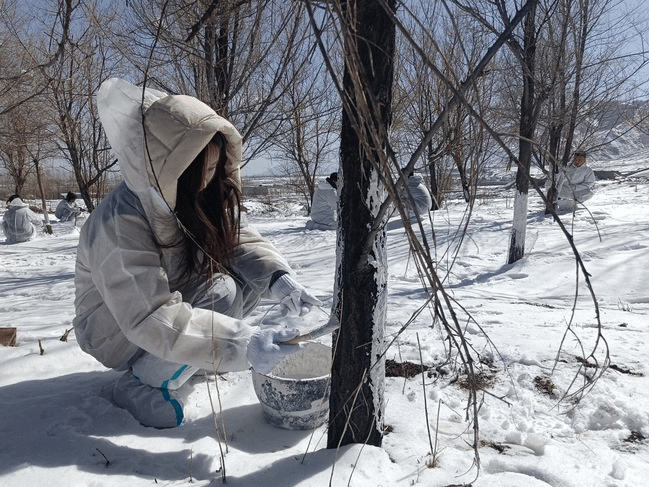 学生志愿者在为树木刷石灰浆