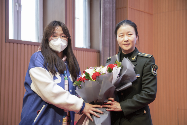 学生为三十里营房医疗站护理组陆军第950医院手麻科护士长陈璐媛少校献花