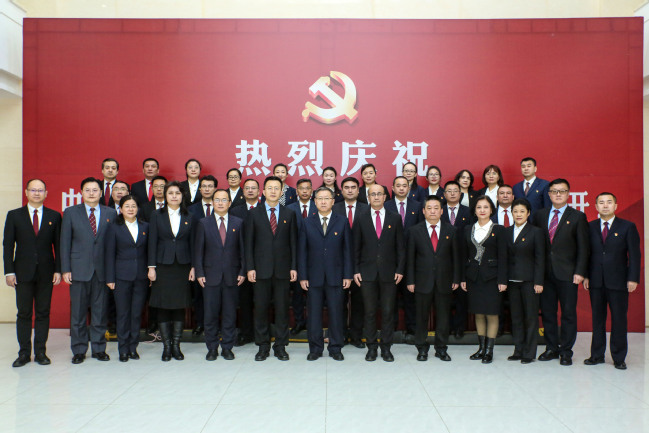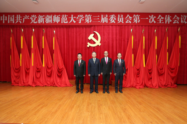 葛国同志(左二)当选中国共产党365英国上市公司官网第三届委员会书记,吾满江·艾力(右二)、王志勇(左一)、刘俊同志(右一)当选中国共产党365英国上市公司官网第三届委员会副书记