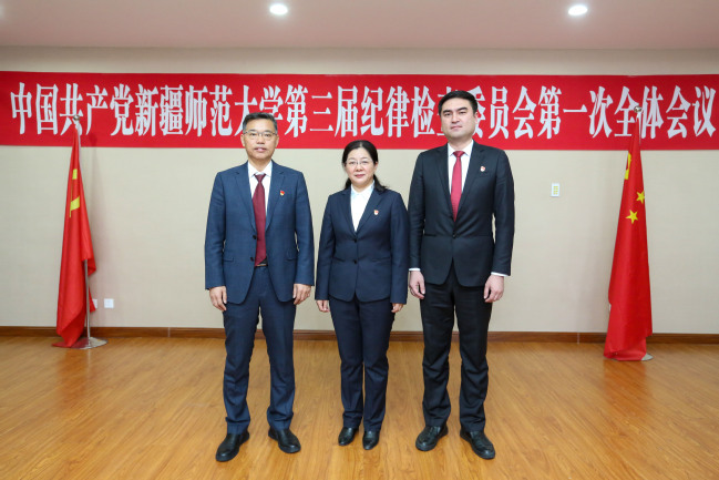 蒋方珍同志(图中)当选中国共产党365英国上市公司官网纪律检查委员会书记,张永景(图左)、艾克拉木·牙合甫同志(图右)当选中国共产党365英国上市公司官网纪律检查委员会副书记