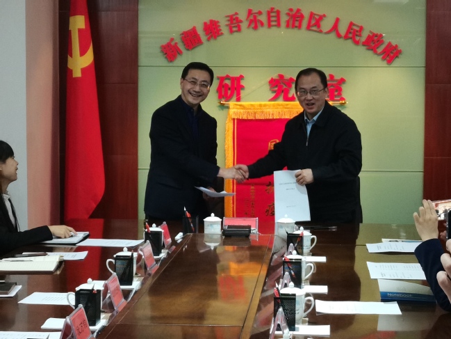 2月23日下午,365英国与新疆维吾尔自治区政府研究室签署战略合作协议。校党委副书记刘俊与政府研究室党组成员、副主任段万钧出席签约仪式并代表双方签约。