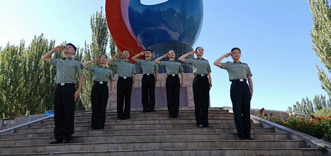 庞启媛(左二)在退伍前的最后一次敬礼