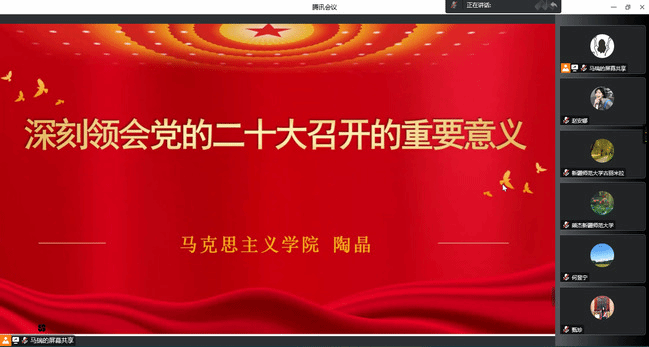 根据学校党委工作安排,12月23日下午马克思主义学院承办的校内师生巡讲团学习宣传贯彻中国共产党第二十次全国代表大会精神专题学习进学院、进班级集中领学活动之《深刻领会党的二十大召开的重要意义》主题宣讲以线上方式举行,由马克思主义学院副教授陶晶主讲。宣讲会由马克思主义学院党委书记张峥主持,马克思主义学院、商学院、政法学院、历史与社会学院、教育科学学院、中国语言文学学院、外国语学院全体教师参与学习。