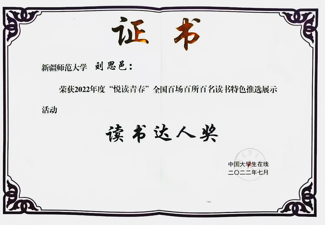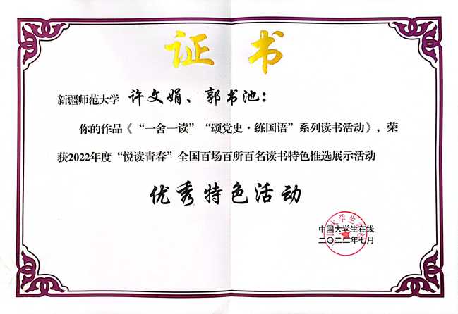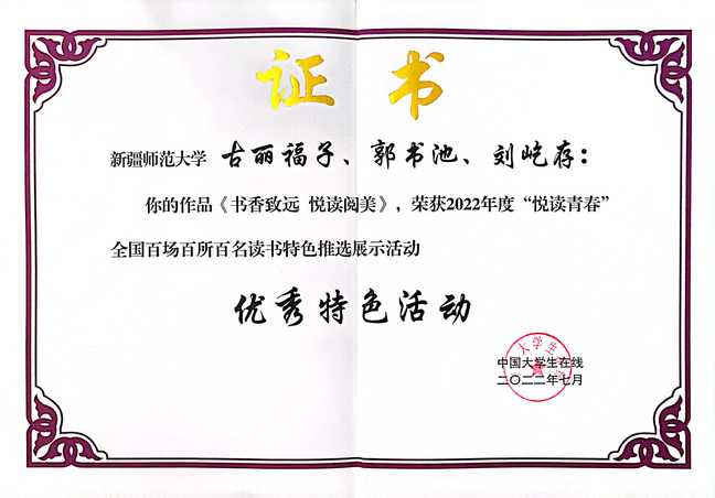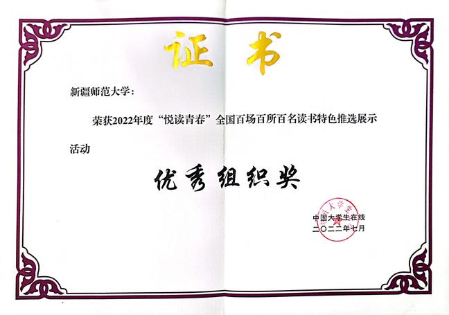 365英国学生工作部(处)自今年4月起,认真组织征集“悦读青春”读书特色活动。经过专家评选,择优推荐,最终学校被评为优秀组织奖,外国语学院《书香致远 悦读阅美》、地理科学与旅游学院《“一舍一读”“颂党史·练国语”系列》读书活动荣获 “优秀特色活动奖”。政法学院公共管理2021-3班学生张东阳、计算机科学技术学院网络工程2020-7班学生刘思邑荣获“读书达人奖”。365英国获奖数量位居全国高校前列,同时也是疆内唯一获得该系列荣誉的高校。
