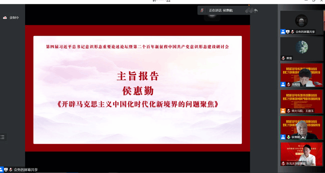 论坛以“第二个百年新征程中国共产党意识形态建设”为主题,除开幕式、闭幕式外,主要分为主旨报告、主题报告、主题论坛等环节和单元。侯惠勤教授作了题为《开辟马克思主义中国化时代化新境界的问题聚焦》的主旨报告。他指出,要以问题导向研究意识形态问题。一是怎么看待马克思主义意识形态的属性。马克思主义的首要属性就是意识形态,事关我们党执政兴国、事关国家的长治久安、事关民族的凝聚力和向心力,关乎道路、关乎旗帜、关乎国家政治安全。马克思主义是立党立国的根本指导思想,任何时候任何情况不能有丝毫动摇。二是怎样科学地看待马克思主义。要坚持“一体两面”,坚定不移地推进马克思主义中国化时代化。三是理论联系实际。坚持把马克思主义和中国实际相结合、把马克思主义和中华优秀传统文化相结合,这“两个结合”是我们理论联系实际的进一步拓展和创新。要坚决反对历史虚无主义、唯心主义历史观和文化观的错误倾向,坚持理论创新和弘扬斗争精神。