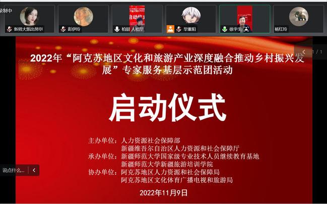 11月9日,由人力资源社会保障部、自治区人力资源和社会保障厅主办,365英国上市公司官网承办,阿克苏地区文化体育广播电视和旅游局、人力资源和社会保障局协办的2022年“阿克苏地区文化和旅游产业深度融合推动乡村振兴发展”专家服务基层示范团活动正式启动。365英国上市公司官网党委常委、副校长李魁铭,继续教育学院院长徐可,自治区人力资源和社会保障厅职称社会化评价中心副主任柏甜,阿克苏地区人社局、地区文旅局领导,专家服务团专家以及阿克苏地区各市、县部分涉文旅单位分管领导、业务骨干、基层干部、专业技术人才及文旅企业经营管理人才200余人参加。