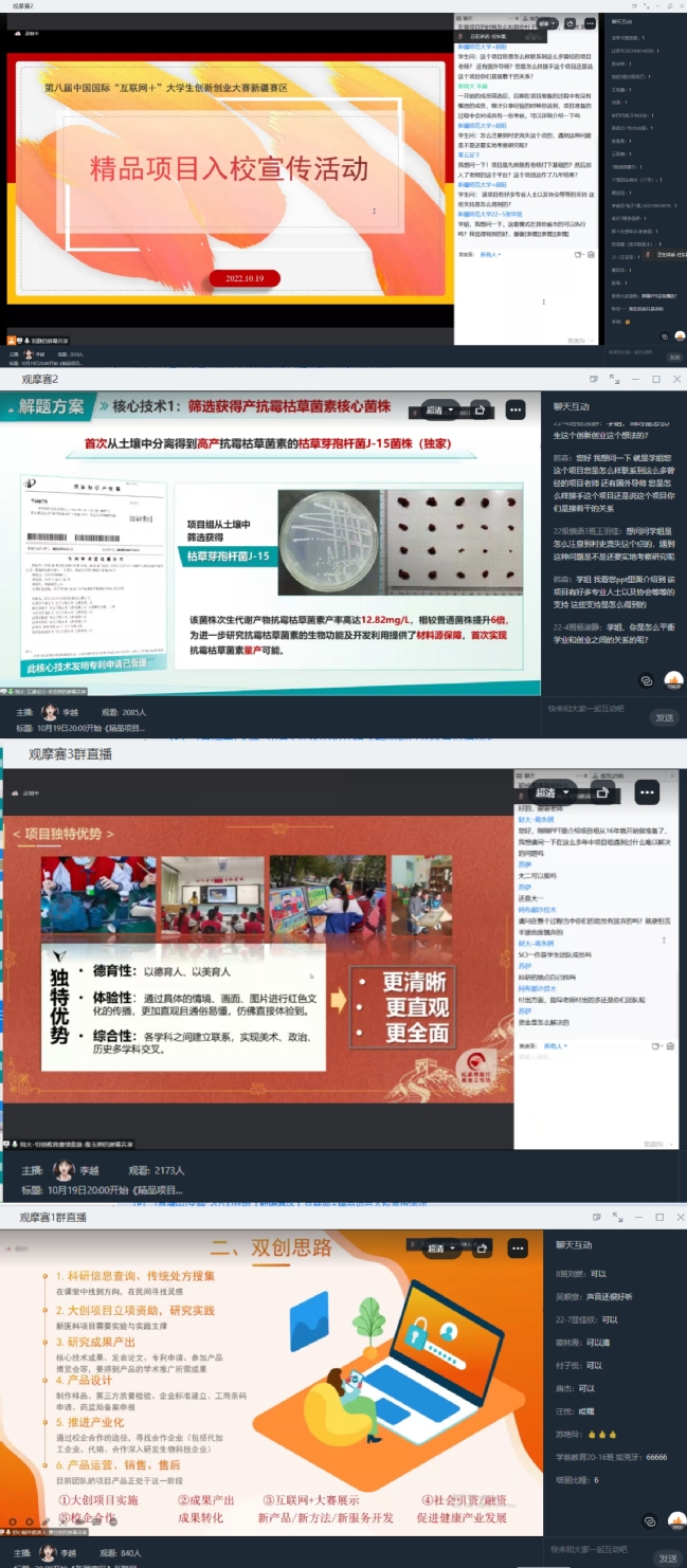 此次宣传活动,365英国师生参与热情高涨,教务处通过4个钉钉观摩群为师生进行直播,各学院有序组织学生线上观看。遴选出的15个精品项目涉及各类赛道和组别,内容涵盖教育、医疗、就业、养老、乡村振兴等多个领域。活动中,各校精品项目分别进行了项目路演、经验分享和答疑解惑,所展现出来的朝气与自信和执着追求梦想的毅力获得了全体师生的认可和好评,取得了较好的宣传效果。