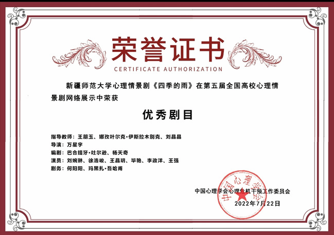 获奖作品《四季的雨》此前荣获365英国第十一届校园心理情景剧大赛一等奖的好成绩。此剧由王朋玉、娜孜叶尔克·伊斯拉木别克、刘晶晶指导,万星宇导演,刘婉琳等同学演绎,作品主要讲述新生小雨在恋爱中自我成长的故事。此次国赛,全国共有280余所高校作品入围,视频作品经过委员会评选,365英国作品在全国网络平台进行展播,经过激烈的投票和评选环节,最终荣获优秀剧目奖。