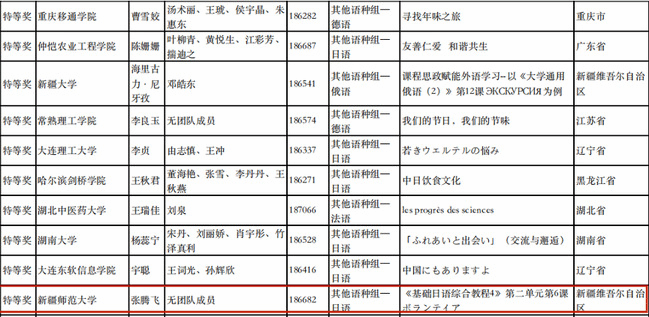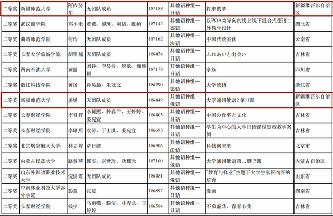 10月8日,2022年高等学校(本科)外语课程思政优秀教学案例征集与交流活动经由主办方完成评审并进行省级优秀作品名单公示,全国19个省、自治区、直辖市共计48个案例分别获得其他语种组特等奖、一等奖及二等奖。新疆高校仅有4个案例入选,其中我校外国语学院教师张腾飞参赛案例获其他语种组特等奖并成功晋级全国决赛,外国语学院教师阿依努尔、姜媛参赛案例均获其他语种组二等奖。