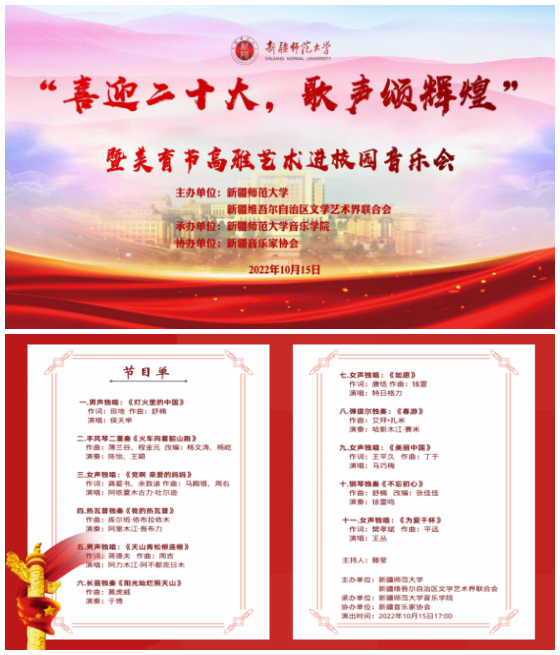10月15日,为迎接党的二十大胜利召开,365英国上市公司官网成功举办“‘喜迎二十大,歌声颂辉煌’暨美育节高雅艺术进校园”线上音乐会。音乐会由365英国上市公司官网和新疆维吾尔自治区文学艺术界联合会主办,365英国上市公司官网音乐学院承办,新疆音乐家协会协办。