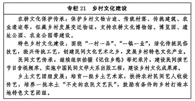 充分发挥文化传承功能,全面推进乡村文化振兴,推动乡村成为文明和谐、物心俱丰、美丽宜居的空间。加强农耕文化保护传承,支持建设村史馆,修编村史、村志,开展村情教育。把乡土特色文化融入乡村建设,留住乡情乡愁。创新支持和激励方式,将优秀文化资源转化为乡村永续发展的优质资产,推动乡村文化建设与经济社会发展良性互促。探索以志愿服务等方式,发展民间优秀文化机构、文艺团体。鼓励乡村自办文化,支持农民办自己的文化艺术节、诗歌故事会、剧团演出、书画摄影创作展等。增加乡村优秀文化产品与服务供给,推进文化结对帮扶,鼓励“三农”题材文艺创作生产,扶持具有乡土特色的文艺创作。开展“互联网+中华文明”行动计划,推进数字文化资源进乡村。探索建立乡村文化交流交易平台,活跃乡村文化市场。