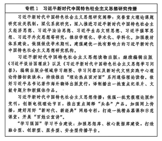 把学习宣传贯彻习近平新时代中国特色社会主义思想作为长期重大政治任务,完善持续深入学习的常态化长效化机制,健全用党的创新理论武装全党、教育人民的工作体系。编辑出版习近平总书记系列重要著作。加强对习近平新时代中国特色社会主义思想整体性系统性研究、学理性阐释和学科性建设,加强对实现马克思主义中国化新的飞跃的重大原创性贡献的研究阐释宣传。持续开展中国特色社会主义和中国梦宣传教育。完善党委(党组)理论学习中心组等各层级学习制度,组织开展列席旁听和督促检查。持续开展党员大规模轮训。综合运用全媒体方式、大众化语言、艺术化形式,结合党治国理政的生动实践和历史性成就,全方位、多层次开展对象化、分众化、互动化理论宣传普及。创新高等学校思政课内容和方式,鼓励文化名家讲思政课,打造思政精品课程,推动党的创新理论进教材、进课堂、进学生头脑。