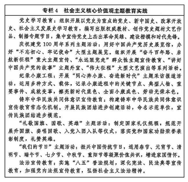 持续深化社会主义核心价值观宣传教育,增进认知认同、树立鲜明导向、强化示范带动。坚持贯穿结合融入、落细落小落实,把社会主义核心价值观要求融入日常生活,融入法治建设。推动理想信念教育常态化制度化,筑牢党员干部、青少年等重点群体的理想信念之基。围绕“七一”、“八一”、“十一”等重大时间节点,依托革命历史类纪念设施、遗址和爱国主义教育基地等载体,加强爱国主义、集体主义、社会主义教育,弘扬党和人民在各个历史时期奋斗中形成的伟大精神。加强公益广告宣传。统筹开展诚信教育、勤俭节约教育、劳动创造幸福主题宣传教育。强化祖国统一和民族团结进步宣传教育,深化“一国两制”实践教育,强化全民国防教育,促进平安中国建设。