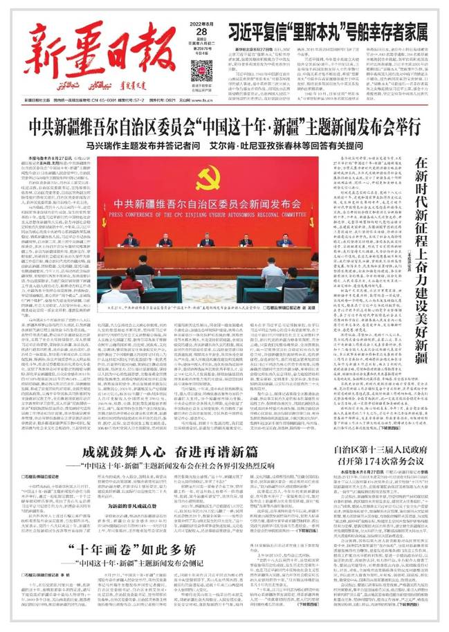 党的十八大以来的十年,是党和国家事业取得历史性成就、发生历史性变革的十年,也是习近平新时代中国特色社会主义思想在新疆伟大实践、奋力开创社会稳定和长治久安新局面的十年。十年来,以习近平同志为核心的党中央始终心系新疆改革发展稳定、情系新疆各族人民。每当进入关键时期,习近平总书记都亲自为新疆谋篇布局、把脉定向、掌舵领航。总书记2014年亲临新疆视察,之后又相继召开了第二次、第三次中央新疆工作座谈会,并多次主持召开专题会议研究部署新疆工作,明确将社会稳定和长治久安作为新疆工作总目标,确立了新时代党的治疆方略,提出了依法治疆、团结稳疆、文化润疆、富民兴疆、长期建疆的要求。特别是今年7月12日至15日,总书记再次亲临新疆视察,看望慰问各族干部群众,并发表重要讲话、作出重要指示,为我们做好新形势下新疆工作注入了强大的政治动力、精神动力和工作动力。全区2585万各族干部群众深受鼓舞、倍感振奋,牢记领袖嘱托,衷心拥护“两个确立”、忠诚践行“两个维护”,坚定沿着总书记指引的正确方向,奋发有为建设美好新疆。当前的新疆,社会大局稳定、人民安居乐业,天山南北处处呈现一派安定祥和、蓬勃发展的新气象。