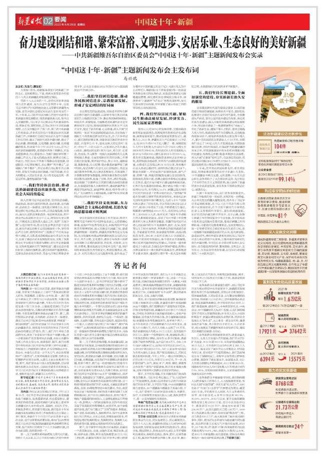 坚持以人民为中心的发展思想,完整准确全面贯彻新发展理念,统筹疫情防控和经济社会发展,统筹发展和安全,推动发展成果惠及民生、凝聚人心。2021年,新疆地区生产总值接近1.6万亿元,较2012年的0.74万亿元翻了一番。城镇居民年人均可支配收入由2012年的17921元增长至2021年的37642元,农村居民年人均可支配收入由2012年的6394元增长至2021年的15575元。着力夯实发展基础,铁路营业里程达到8768公里,和若铁路开通运营、世界首个沙漠铁路环线贯通。公路通车总里程达到21.73万公里、所有地州市迈入高速公路时代。民用机场总数达到24个,数量全国第一。特色优势产业加快发展,油气产量、原煤产量、风能太阳能发电量位居全国前列。持续深化改革开放,丝绸之路经济带核心区建设扎实推进,重点开发开放平台建设取得积极进展,对外开放大通道初步形成,累计始发中欧(中亚)班列6242列、年均增长55.1%,新疆已经从相对封闭的内陆变成了对外开放的前沿。“放管服”等重点领域和关键环节改革持续深化,市场化法治化国际化营商环境不断优化,先后与176个国家和地区建立了经贸关系,全区市场主体达到221.8万户、较2012年增长了2倍。不断增进民生福祉,城镇累计新增就业498.87万人,农村劳动力外出务工3090.88万人次,基本实现了城乡有劳动能力的人都能稳定就业。实现了农村学前3年免费教育和九年义务教育全覆盖,南疆四地州实行从幼儿园到高中的15年免费教育。医疗、社保、安居等民生工程全面推进,各族群众的获得感成色更足、幸福感更可持续、安全感更有保障。决战决胜脱贫攻坚,306.49万农村贫困人口全部脱贫,3666个贫困村全部退出,35个贫困县全部摘帽,绝对贫困问题得到历史性解决,同全国一道全面建成了小康社会。加强生态环境保护建设,统筹山水林田湖草沙一体化保护和系统治理,统筹推进节水蓄水调水,建成阿尔塔什等一批大型水利枢纽工程,水资源集约节约利用水平不断提升。