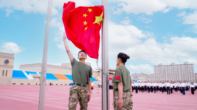 上午9时整,升旗仪式正式开始,英姿飒爽的国旗护卫队迈着铿锵有力的步伐,护送鲜艳的五星红旗入场。迎着旭日的晨曦,伴随雄壮的国歌,在全体师生注目下,鲜艳的五星红旗冉冉升起、迎风飘扬。与会师生庄严肃立,面向国旗行注目礼,高唱国歌,共同祝愿我们伟大的党青春永驻,伟大的祖国繁荣富强,伟大的人民幸福安康。