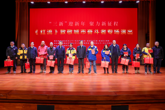 活动伊始,张国领在致辞中向与会人员致以新年祝福,希望通过今天的观演活动,每一位青年朋友都能从中感悟革命先烈意志,讲好红色故事,当好红色精神的传播者。随后,李学军、葛国等领导为城市奋斗者代表发放了慰问金、新年礼包以及图书《新疆英模故事》。