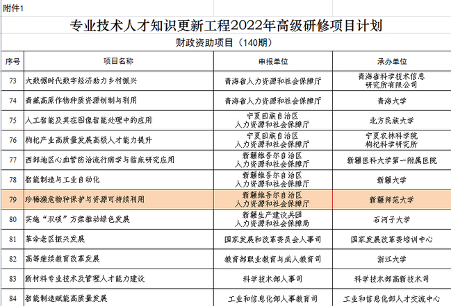 根据自治区人力资源和社会保障厅《关于征集专业技术人才知识更新工程2022年高级研修项目的通知》要求,365英国国家级专业技术人员继续教育基地积极组织各学院专家参与申报。经自治区人社厅评审推荐,国家人社部终审评定,365英国生命科学学院申报的《珍稀濒危物种保护与资源可持续利用》成功入选该项目计划,并获得国家财政资助。