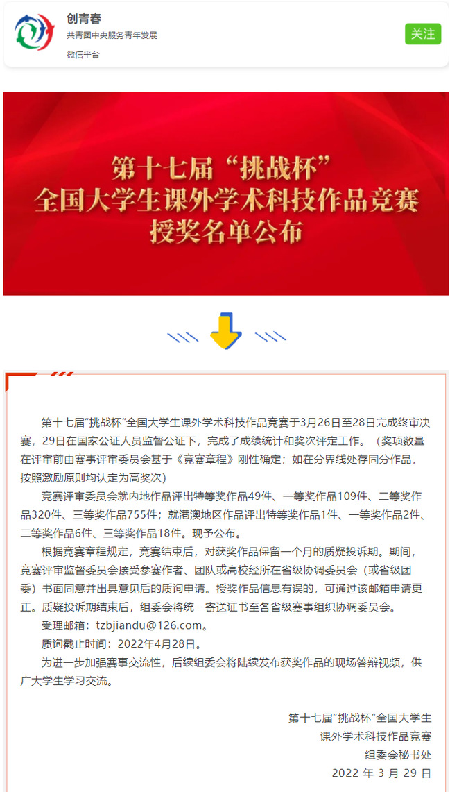 “挑战杯”全国大学生课外学术科技作品竞赛是由共青团中央、中国科协、教育部、全国学联和地方政府共同主办,以“崇尚科学、追求真知、勤奋学习、锐意创新、迎接挑战”为宗旨,自1989年起每2年举办一次,是国内规模最大、规格最高、影响范围最广的综合性学生科技创新赛事,被誉为当代大学生科技创新的“奥林匹克”盛会。