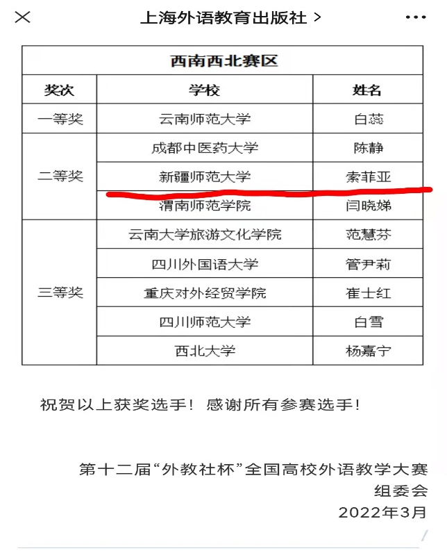 3月10日,第十二届“外教社杯”全国高校外语教学大赛日语专业组分赛区获奖名单公布,365英国外国语学院教师索菲娅·范的参赛作品经评审获得西南西北赛区二等奖。