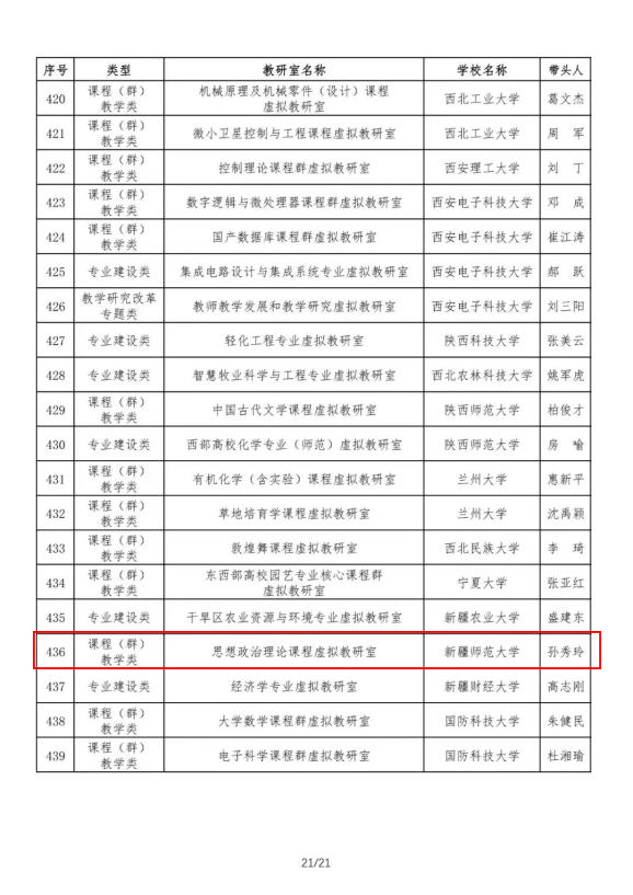 根据教育部办公厅《关于公布首批虚拟教研室建设试点名单的通知》,校党委常委、副校长、马克思主义学院院长孙秀玲教授主持的思想政治理论课程虚拟教研室获批教育部首批虚拟教研室建设试点。新疆地区共获批3项试点,全国高校马克思主义学院入选试点仅8家。