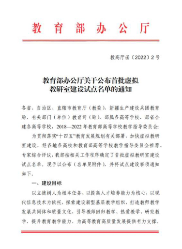 此次首批虚拟教研室建设试点以立德树人为根本任务,以提高人才培养能力为核心,以现代信息技术为依托,探索建设新型基层教学组织,打造教师教学发展共同体和质量文化,引导教师回归教学、热爱教学、研究教学,提升教育教学能力,为高等教育高质量发展提供有力支撑。