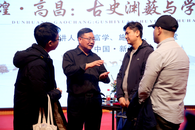 在访谈交流中,施新荣教授针对相关学术焦点问题提出了见解,并向现场师生讲述了我国在文物保护、文化建设等多方面的发展历程。刘学堂教授结合其丰富的考古经历,讲解了河西走廊至新疆东路考古研究概况,表示学术研究永无止境,鼓励青年学子继往开来,努力求学。访谈中,三位教授还就敦煌、高昌两地考古发现的现状及研究进展等学术前沿问题进行了深入探讨。