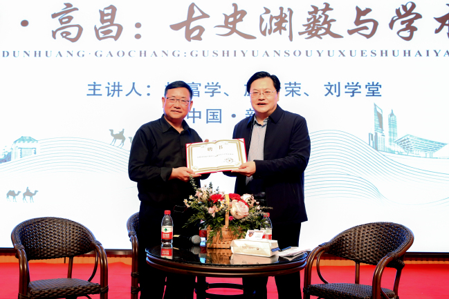 校党委常委、宣传部部长高靖为杨富学教授颁发聘书