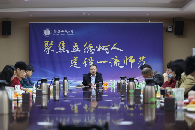 帕力旦·吐尔逊向在读博士教师介绍了学校近年来科研方面取得的成绩。希望博士们能够统一思想到学校规划上,加强与学院的沟通,积极参与学院的科研工作,共同把学校工作做的更好,达到新的高度。