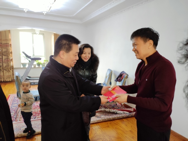 在中国传统佳节春节即将来临之际,为切实把学校党委的关心关怀落实落细,让困难教职工过一个幸福、欢乐、祥和的春节,给离退休老干部、先进工作者们送去新春祝福, 1月18日至20日,校党委书记葛国,副校长古丽帕丽·阿不都拉,校党委常委、副校长李魁铭,校党委常委、纪委书记王志勇,校党委常委、副校长孙秀玲,校党委常委、副校长帕力旦·吐尔逊,校党委常委、组织部部长李建荣分别带队走访慰问了离休干部、退休厅局级领导、自治区先进工作者、自治区劳模、因公牺牲职工家属及困难教职工,送去了慰问金、慰问品。离退休职工管理服务中心、校工会人员陪同慰问。