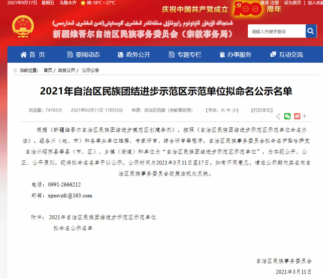 2021年自治区民族团结进步示范区示范单位拟命名公示名单