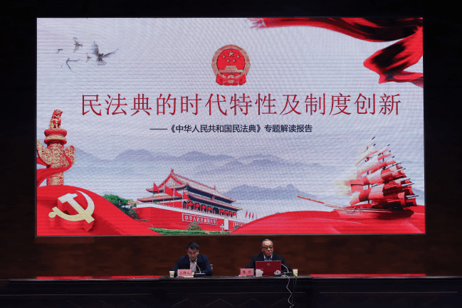 政法学院党委书记陈彤教授的《民法典的时代特性及制度创新》讲座逻辑严谨,内涵丰富,在讲解民法典的诞生及使用范畴的同时,以实际案例深入浅出地对《民法典》的深刻内涵和价值体系进行了解读。