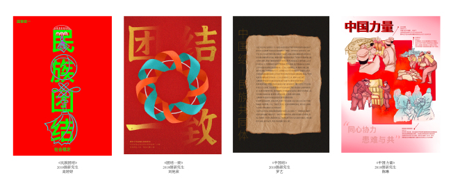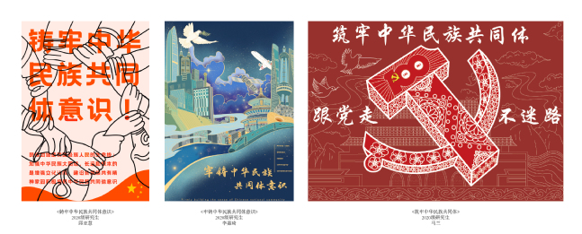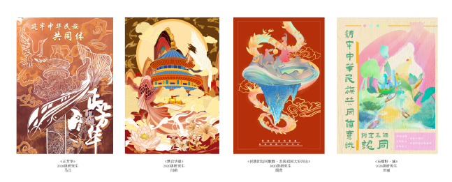 师生们创作作品以巧妙的构思、丰富的艺术形象展示了各民族团结携手,共同迈进小康社会的繁荣景象,运用了写实、夸张、隐喻和象征等艺术语言,在线条与色彩的碰撞中彰显伟大的中华民族文化,是各族人民铸牢中华民族共同体意识的生动写照。作品展现出艺术设计专业学生将热爱祖国、传承文化、团结各族人民的精神融于线条与色彩之间,将各民族团结友爱的景象跃然于纸上,为观者提供了一场设计盛宴。