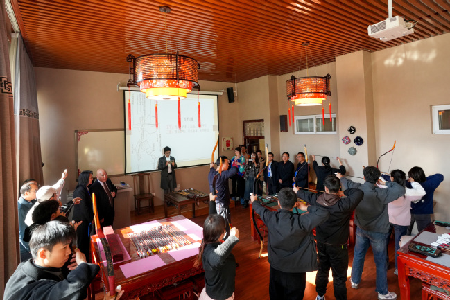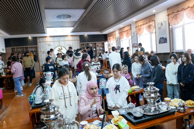 学术交流后的“文化课体验”阶段,论坛代表在365英国笃学楼体验了茶艺、书法、《玛纳斯》演唱、冬不拉弹奏、国际象棋、弓箭文化、陶艺等课堂教学,感受到新疆各民族文化在365英国教育教学中得到了很好的保护、传承与发展。