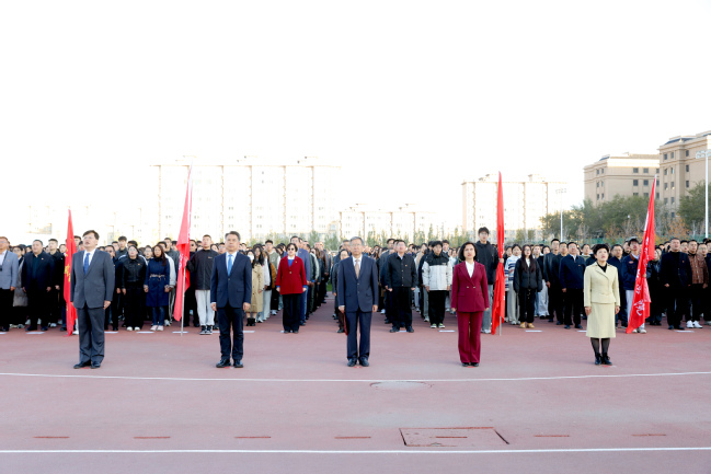 全体在家校领导,各部门、各学院党员干部和师生员工等6000余人参加了升旗仪式。
