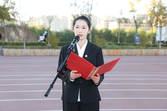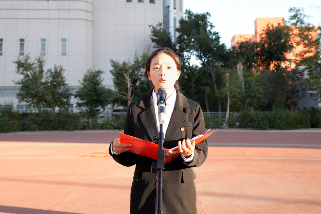 学生代表,历史与社会学院社会工作专业23级6班古力孜巴·牙生、物理与电子工程学院电子信息科学与技术专业23级9班柏同同分别作国旗下发言,以饱含深情的话语,回顾了新中国成立以来取得的伟大成就,表达了作为新时代青年的责任与担当,誓言将个人理想融入国家发展大局,为实现中华民族伟大复兴的中国梦贡献青春力量。